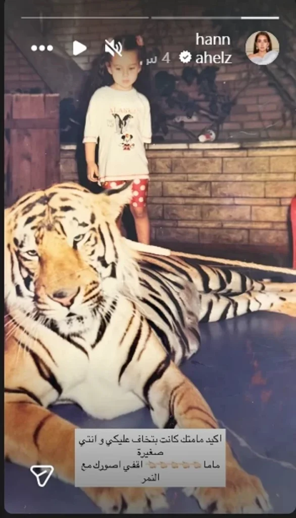 وظهرت هنا الزاهد في الصورة وهي تقف إلى جانب نمر، في مشهد لافت من طفولتها، حيث علّقت على الصورة بأسلوب ساخر قائلة: “أكيد مامتك كانت بتخاف عليكي وأنتي صغيرة، ماما: أقفي أصوّرك مع النمر”.