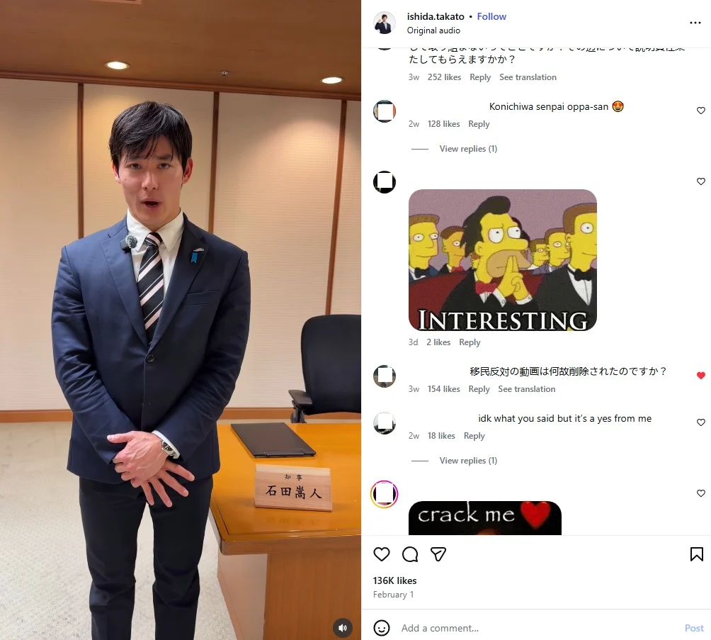 وكانت ذروة هذا الاهتمام قد بدأت مع توليه المنصب في كانون الثاني/يناير، حين حصد مقطع فيديو نشره عبر “إنستغرام” أكثر من 150 ألف إعجاب، وسط تعليقات أشادت بشخصيته وحضوره، وفق ما نقلته وسائل إعلام يابانية، من بينها “J-CAST News”.