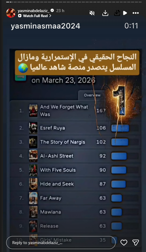 وشاركت ياسمين جمهورها عبر حسابها الرسمي على “إنستغرام” مجموعة من المنشورات، استعرضت من خلالها تحقيق المسلسل المركز الأول في نسب المشاهدة، ليس فقط في الدول العربية، بل في عدد من الدول الأوروبية أيضًا، ما يعكس امتداد نجاحه خارج المنطقة.
