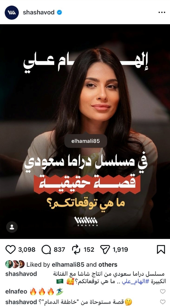 وكانت منصة “شاشا” قد شوقت الجمهور للمشروع عبر حسابها الرسمي في “إنستغرام”، من خلال نشر صورة لإلهام علي، مرفقة بتعليق: “إلهام علي.. في مسلسل درامي سعودي، قصة حقيقية، ما هي توقعاتكم؟”، قبل أن تعود لتلمّح إلى أن العمل قد يكون مستوحى من قضية “خاطفة الدمام”، التي أثارت جدلاً واسعاً في المملكة.