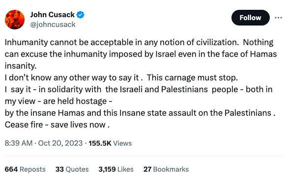 متابعة بتجــرد: عبّر الممثل الأميركيّ جون كوزاك عن غضبه ممّا يحصل في فلسطين، وأدان ممارسات الاحتلال الإسرائيليّ واستهدافهم المدنيّين في قطاع غزة.